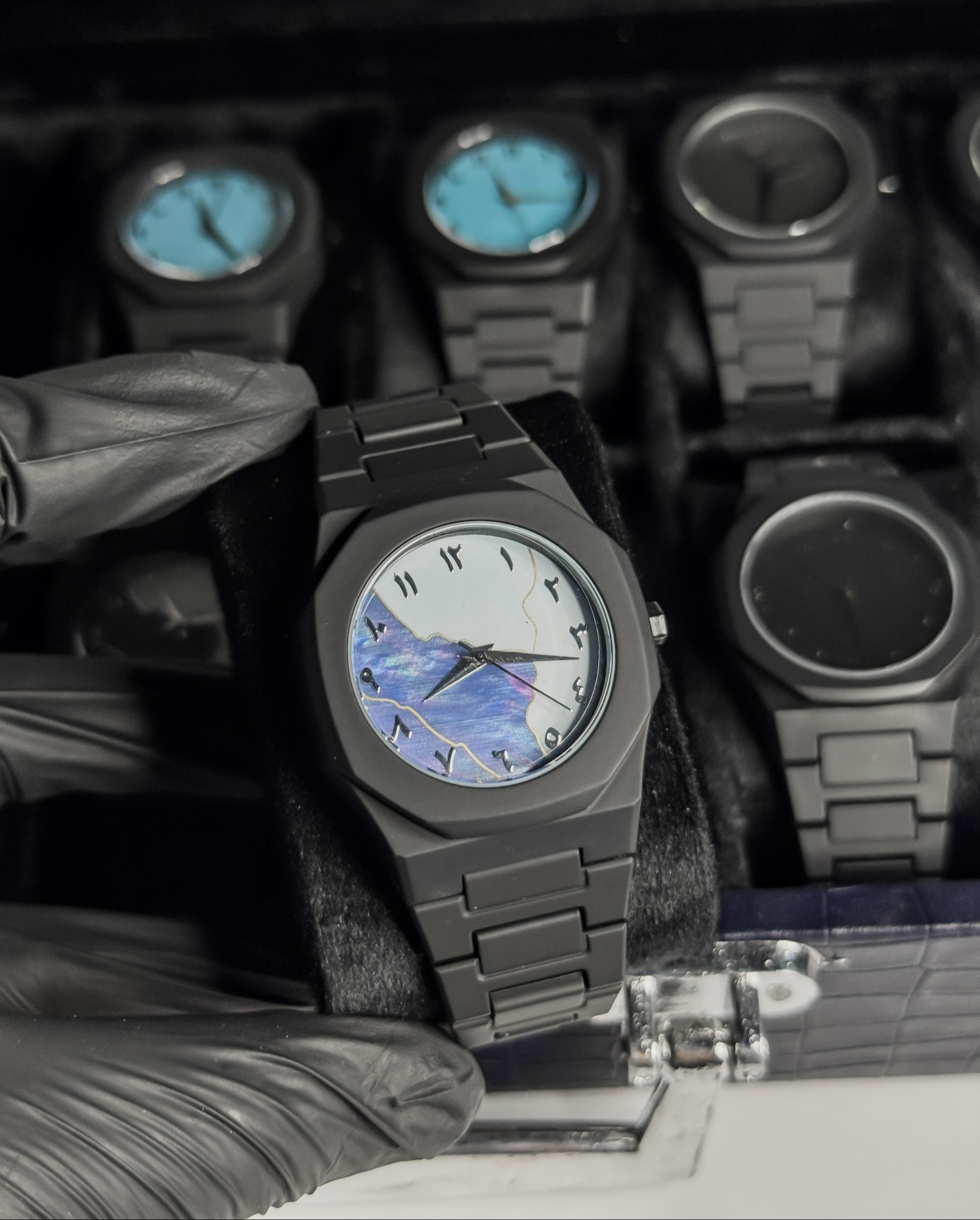 Crafted for modern gentlemen, the Blue & White Arabic Aura Watch combines refined craftsmanship with contemporary elegance.