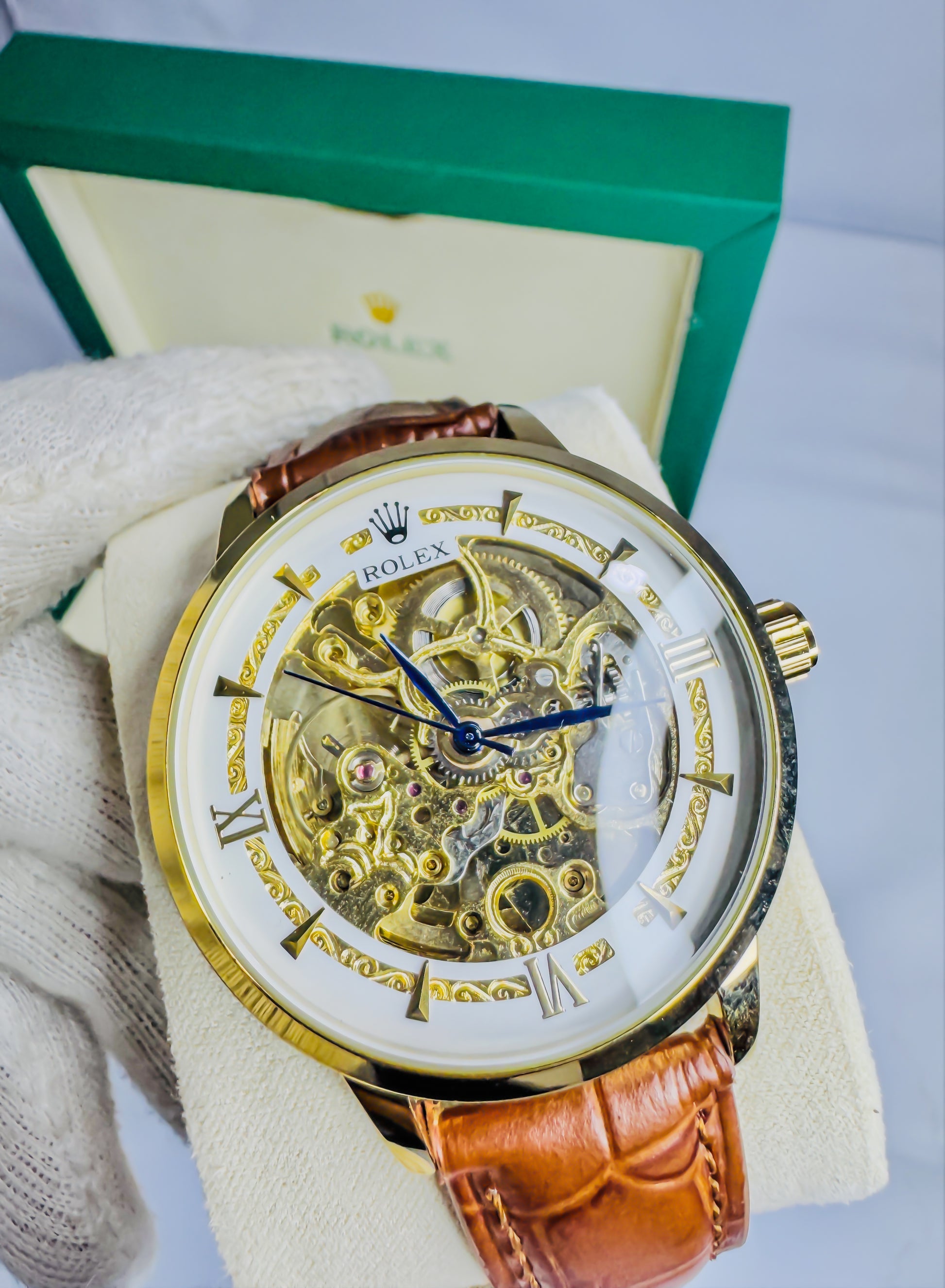 Unveil the mechanics of true craftsmanship with the Rolex Royale Automatic Skeleton — a luxurious timepiece designed to showcase the beauty of precision engineering. Its fully exposed golden dial reveals the intricate movement within, making it not just a watch, but a masterpiece of timeless design.
