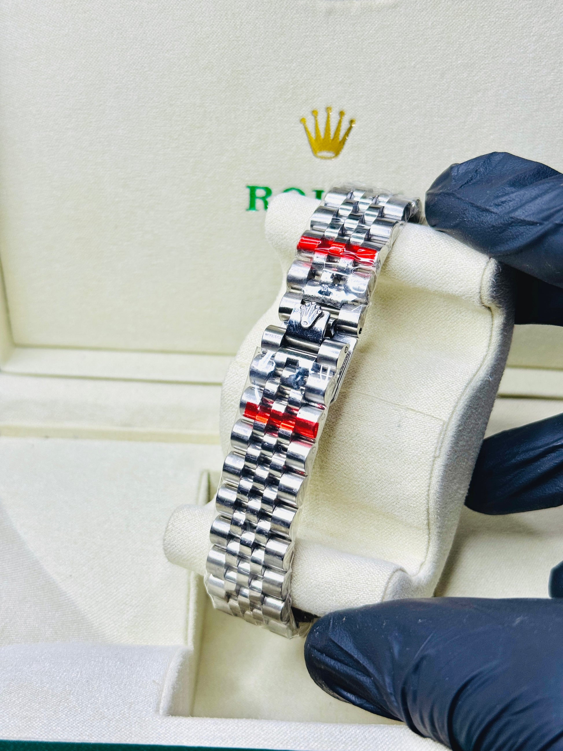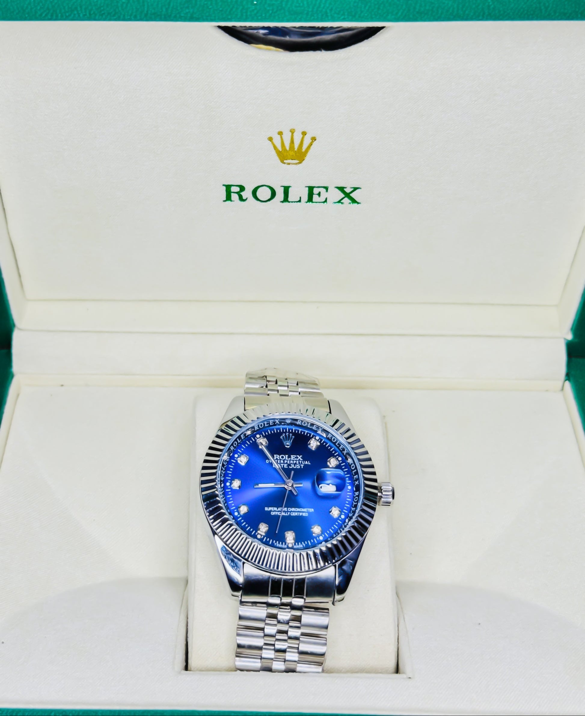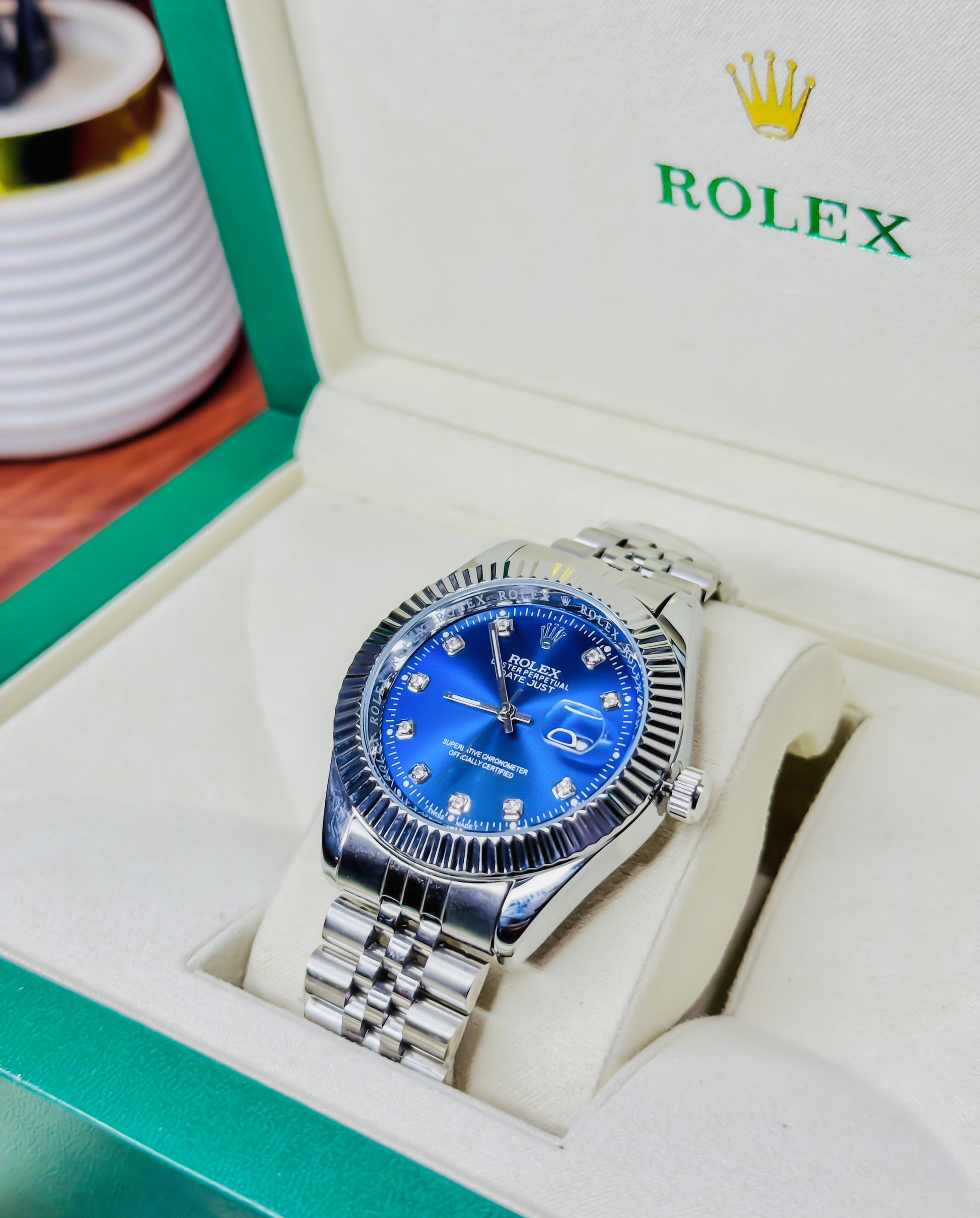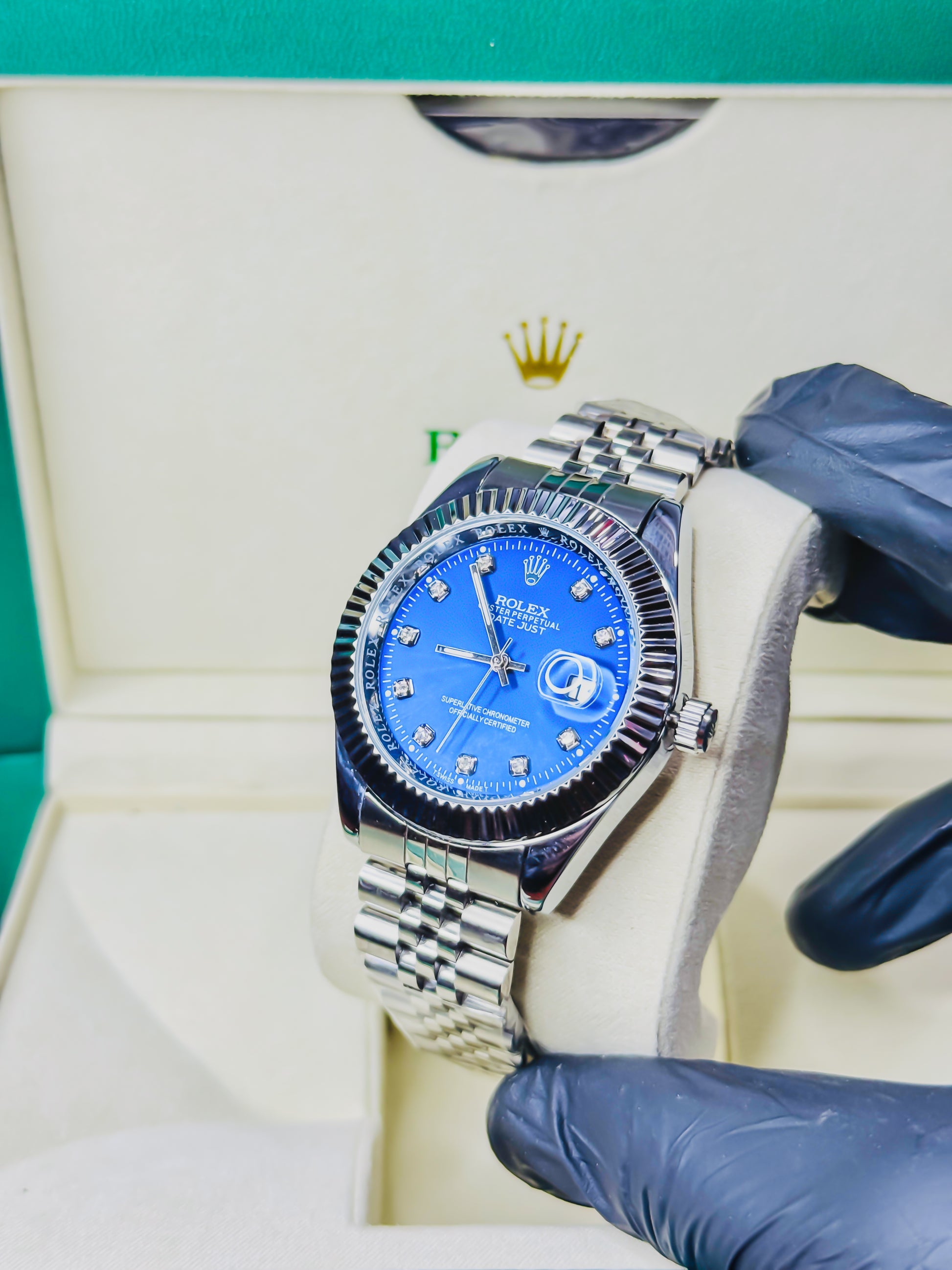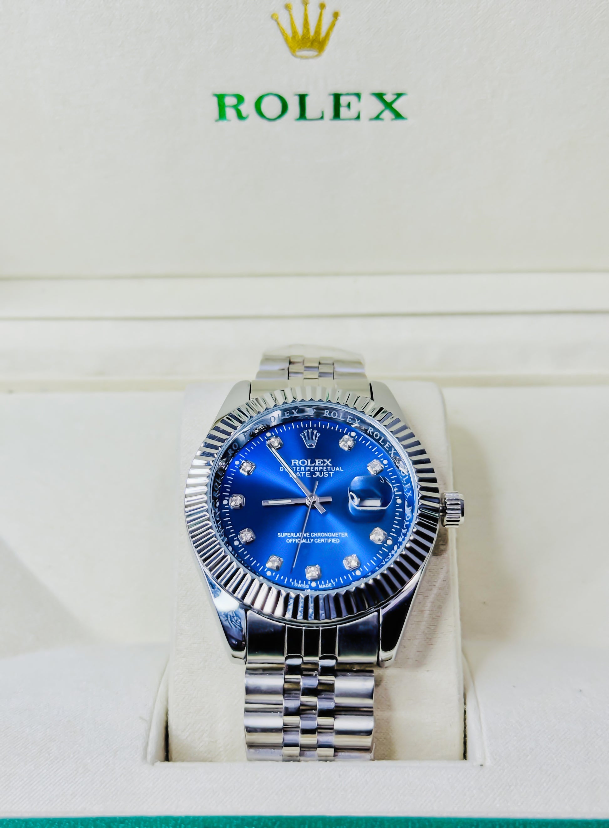 Step into the spotlight with the Rolex Blue Dial Royale β a masterpiece of elegance designed to captivate. Its deep blue dial glimmers with crystal-styled markers, perfectly paired with a mirror-polished steel bracelet that radiates sophistication. This timepiece embodies the essence of luxury and bold charm.